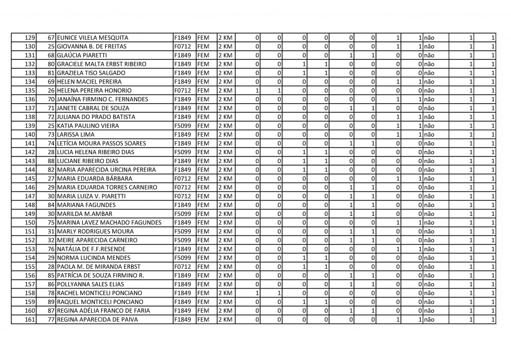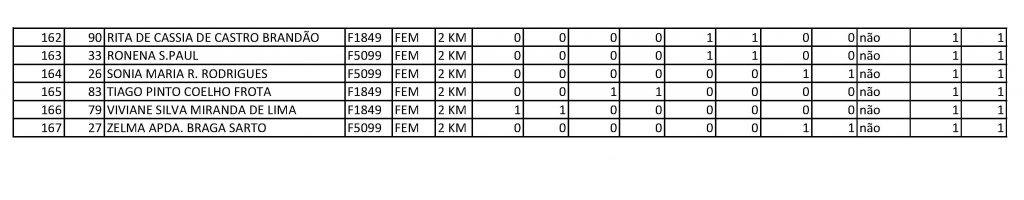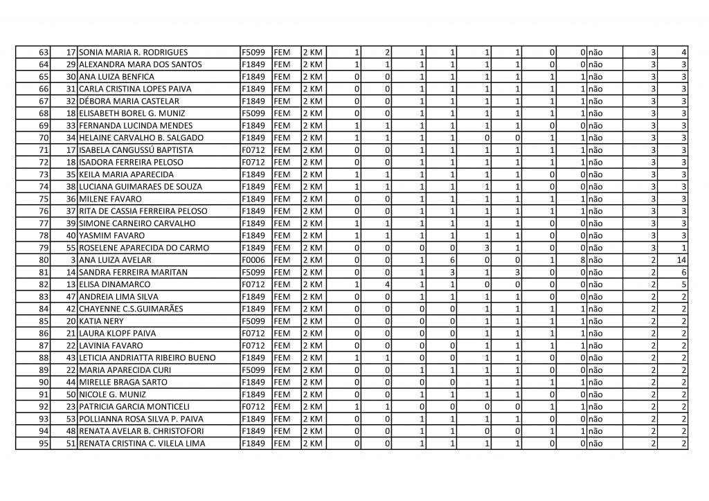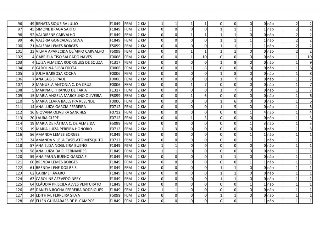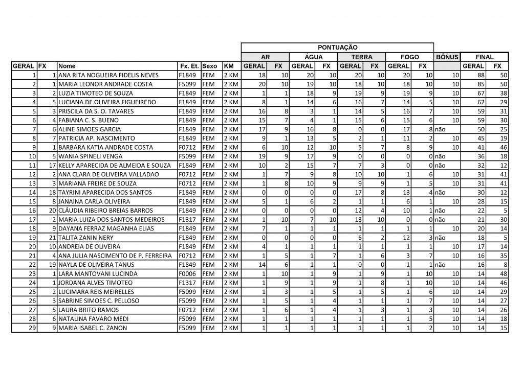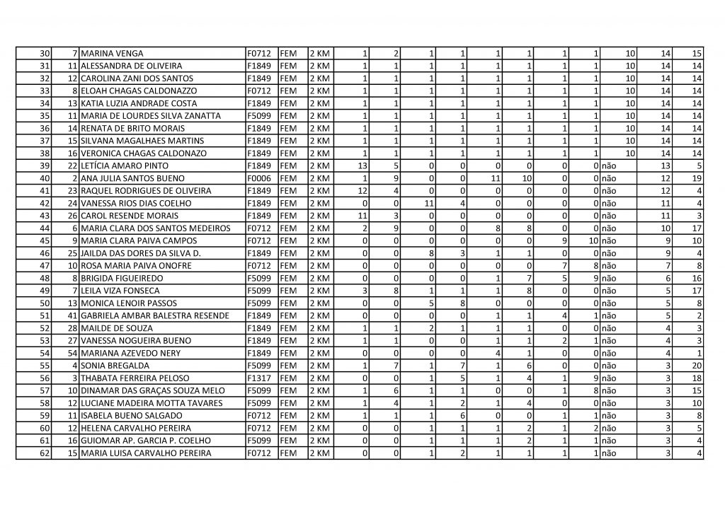 Resultado geral 2km feminino