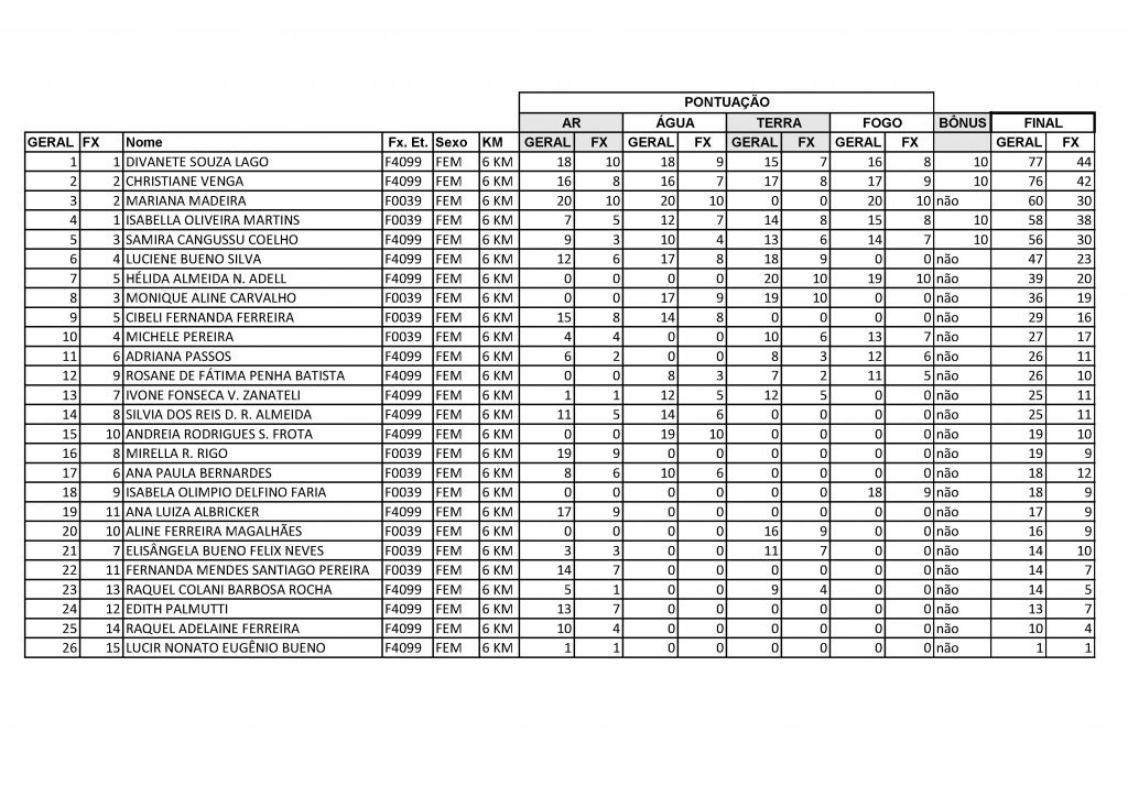 Resultado geral 6km feminino