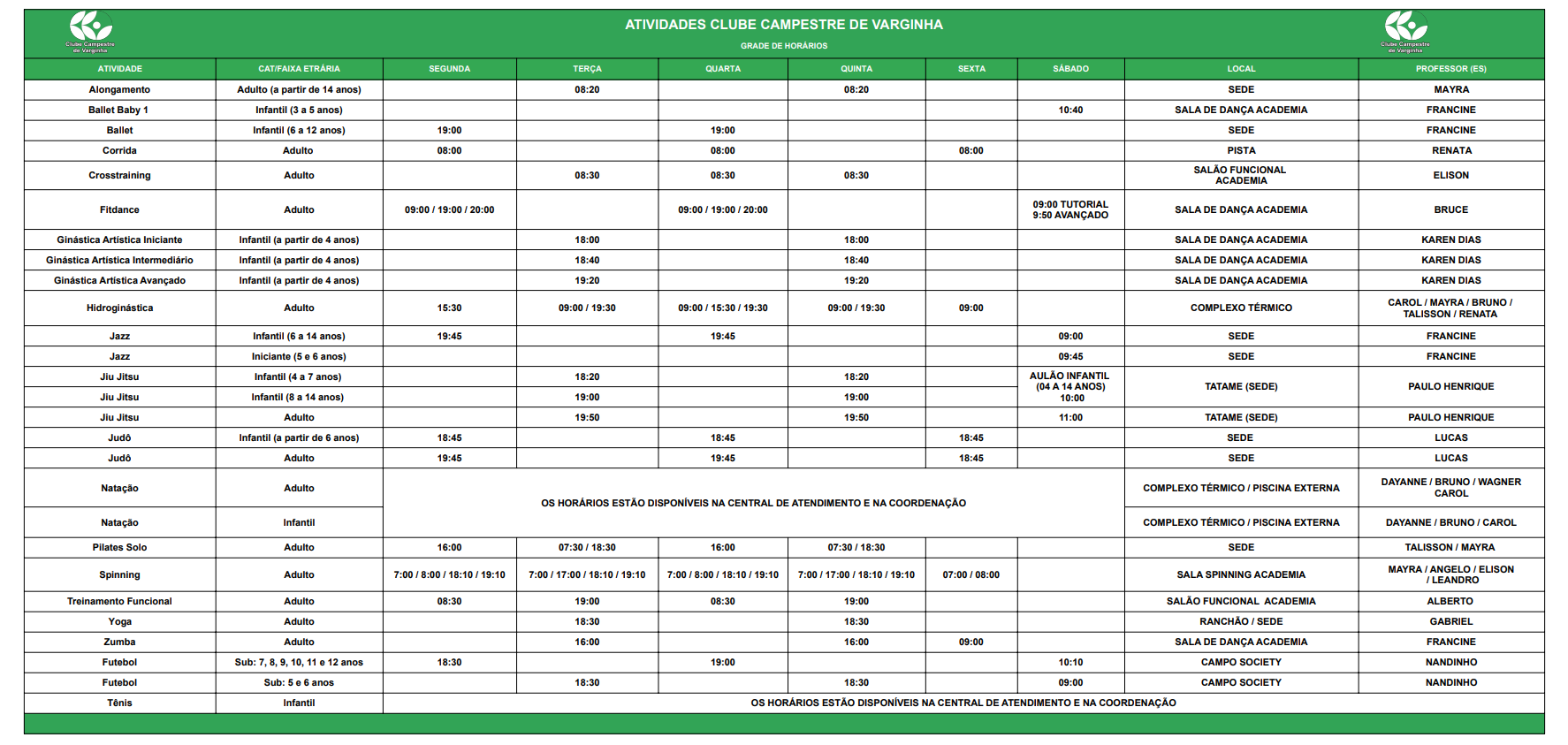 Com professores qualificados e estrutura adequada, as atividades promovem saúde, lazer, disciplina e integração. Confira abaixo a grade de modalidades e horários e descubra tudo o que o Clube preparou para você e sua família.
