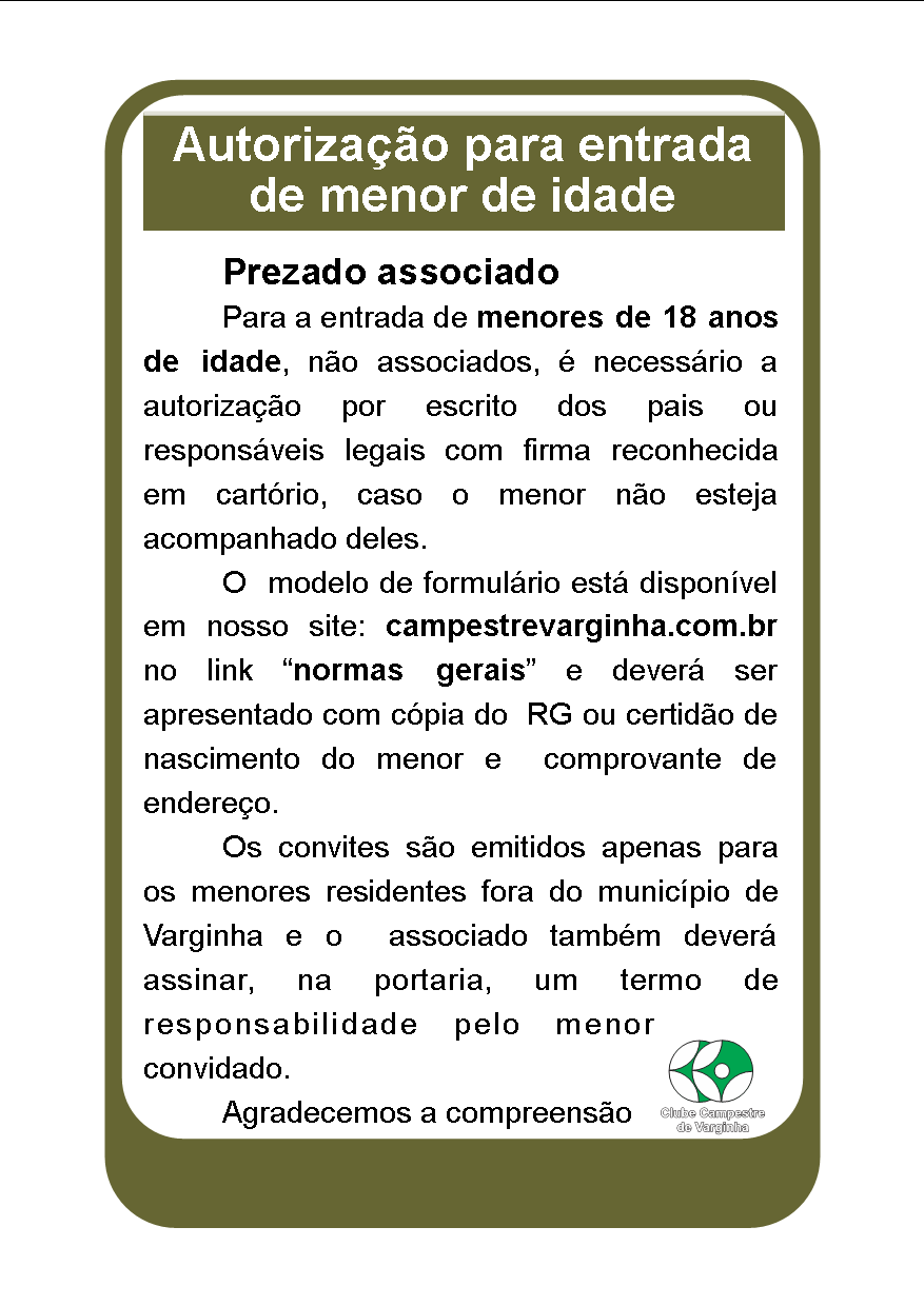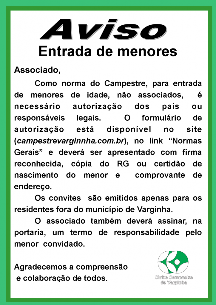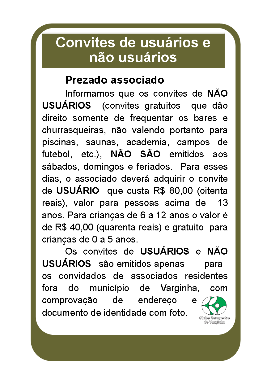 OBS: Convidados de 06 até 12 anos e filhos de sócios residentes fora de Varginha terão REDUÇÃO DE 50% nos valores dos convites. Menores de 6 anos estão dispensados de pagamentos.